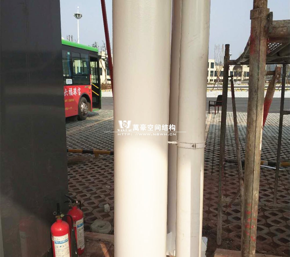 而本工程位于岳池火車站的對面的客運(yùn)中心,是比亞迪公交車充電樁的附屬設(shè)施。工程總用鋼量達(dá)8噸,膜材面積400平方米,以雙挑的形式為現(xiàn)場的充電樁遮陽擋雨。